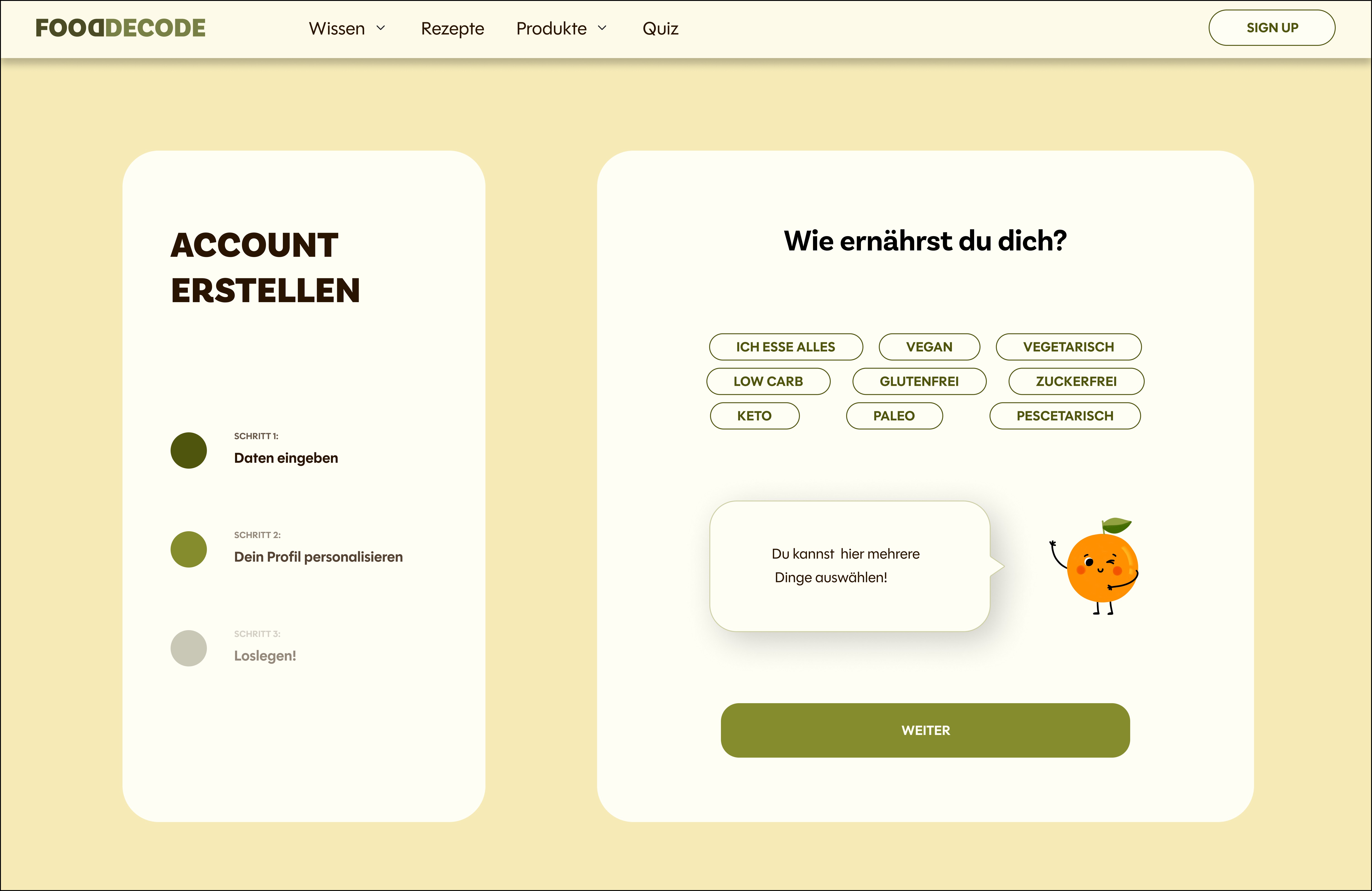 During the onboarding process, users answer a few short questions about their goals and dietary preferences.